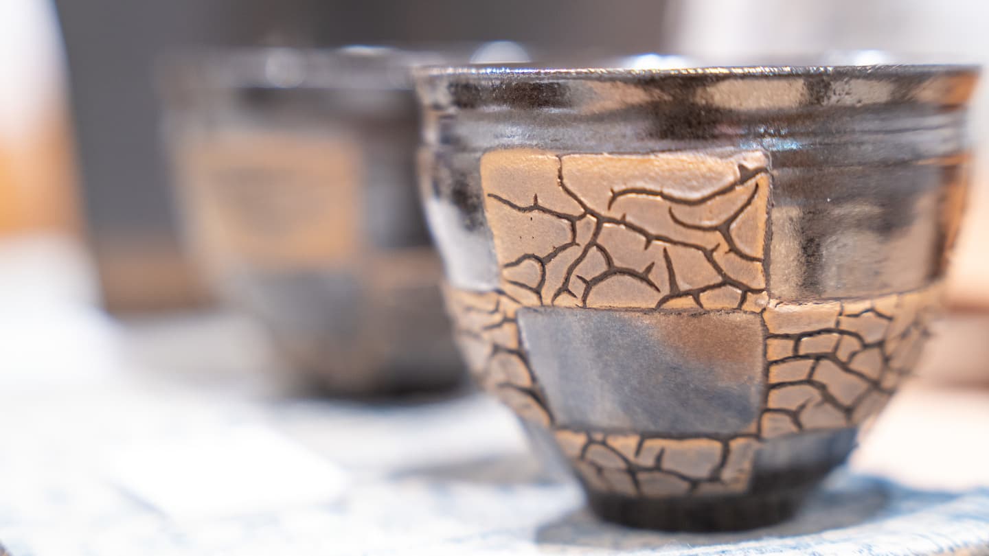 オリジナルのひび割れる金色の釉薬と黒い釉薬を使用したうつわを出品しております。